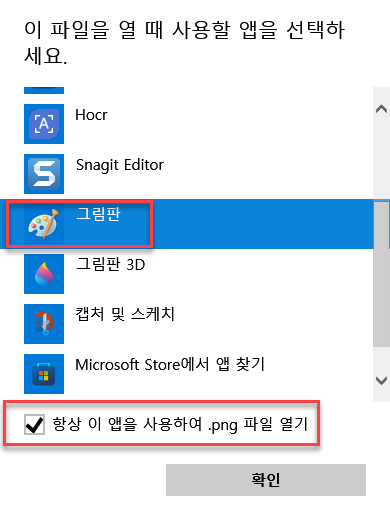즉, 특정 파일에서 우클릭 "연결 프로그램" ▶"다른 앱 선택" 에서 이 파일을 열때 사용할 앱을 지정하고, "항상 이 앱을 사용하여 ... 파일 열기"를 체크하면, 항상 동일한 프로그램이 실행됩니다.